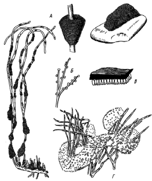 Рис. 35. Кладки икры тихоокеанской сельди (А), карпа (В), ротана (В), окуня (Г)