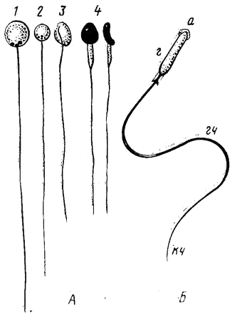 Зрелый сперматозоид представляет собой клетку с малым количеством плазмы. В нем различают головку, среднюю часть и хвост (рис. 36). Форма головки различна: в виде шара, яйца, желудя (у большинства костистых рыб), палочки (у осетровых и некоторых костистых), копья (у двоякодышащих), цилиндра (у акуловых, кистепёрых). В головке помещается ядро. Впереди ядра у акулообразных, осетровых и некоторых других рыб располагается акросома; у костистых акросомы нет. Ядерная часть головки сперматозоида состоит преимущественно из дезоксирибонуклеопротеида (нейтральная соль ДНК с основным белком – протамином) и небольшого количества РНК. Концентрация ДНК в головке (ядре) составляет 38,1% (карп), 48,4% (семга) и отражает количество ДНК в гаплоидном наборе хромосом. Протамины состоят из 6–8 аминокислот, среди которых преобладает аргинин. В средней части сперматозоидов обнаружены митохондрии, играющие основную роль в снабжении клетки энергией. В хвостовой части выявлены белки, лецитин, жиры и холестерин. Сперматозоиды большинства костистых рыб имеют общую длину 40–60 мкм (головка 2–3мкм).