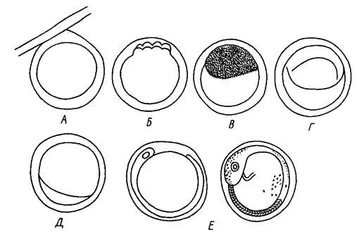 В – морула мелких клеток; Г – бластула; Д – обрастание желтка; Е – органогенез