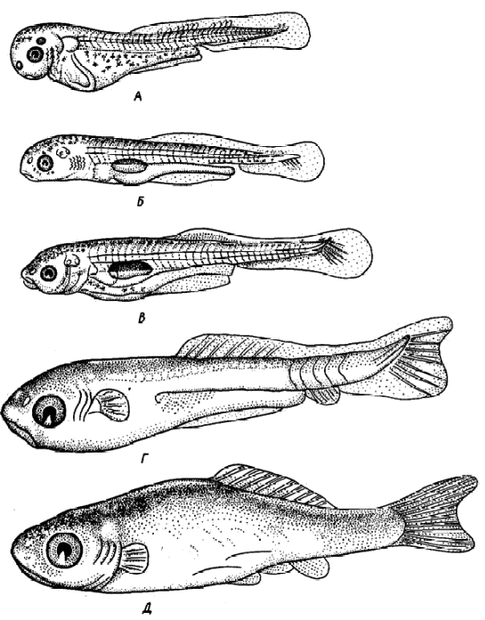 В – личинка, l = 8,5 мм (4-е сутки); Г – личинка, l = 12,5 мм (8-е сутки); Д – личинка, l = 16 мм (14-е сутки)