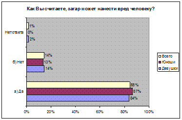Большинство - 85% респондентов считают, что загар может быть полезным для человека, так как «улучшается здоровье кожи», «организм укрепляется», «витамины от солнца». Но почти одинаковое количество юношей 13% и девушек 14% считают, что загар не может нанести вред человеку, «потому что это полезно для кожи», «загар не вредит организму, а защищает его».