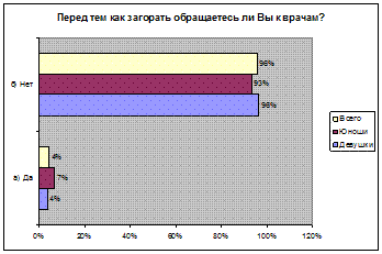 96% респондентов не обращаются к врачам, перед тем как загорать. И только 4% обращаются за медицинской консультацией.