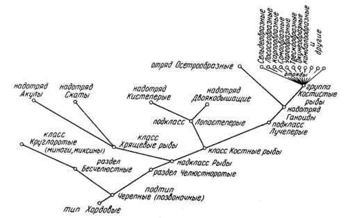 Рис. 1. Положение основных групп рыб в системе животных (по Наумову, Карташеву, 1979, с сокращениями)