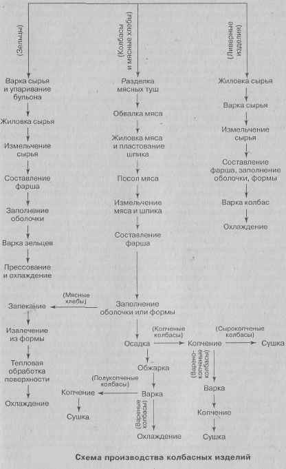 Туши, мяса для производства колбас разделывают на отрубы по схемам колбасной разделки, выделяя ценные части мяса для полуфабрикатов. При этом мясо жилуют, т. е. освобождают.от сухожилий, лимфатических узлов, кровеносных сосудов, пленок, жира, и сортируют. Говядину для колбасного производства делят на три сорта. Мясо высшего сорта содержит исключительно мышечную ткань, в 1-м допускается не более 6% соединительной ткани и жира, а во 2-м — до 20%. Кроме того, используют жирную жилованную говядину с содержанием жира и соединительной ткани не более 35%. Свинину применяют нежирную, содержащую не более 10% жира, полужирную с содержанием от 30 до 50% жира и жирную, в которой жира от 50 до 85%. Баранину используют жилованную односортную с содержанием соединительной и жировой тканей не более 20%. Жилованное мясо, состоящее преимущественно из мышечной ткани, применяют для изготовления колбас высших сортов.