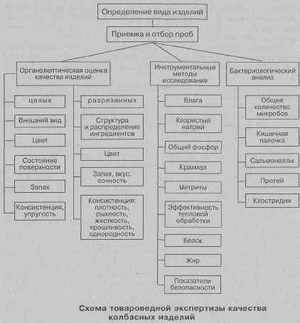Качество колбасных изделий оценивают по внешнему виду, цвету и состоянию поверхности, вкусу и сочности, виду на разрезе (структуре и распределению ингредиентов) и консистенции. Определяют также содержание влаги, поваренной соли, нитрита, крахмала и фосфора. Кроме того, отмечают дефекты изделий, а также определяют степень их свежести: