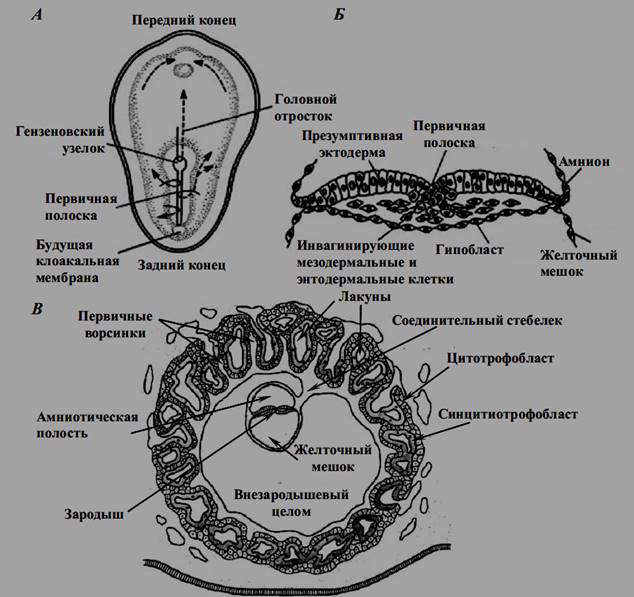 Рис.1: Клеточные движения в период гаструляции (А, Б) и схема строения зародышана стадии поздней гаструлы (В) у млекопитающих: