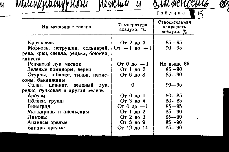 Свежие плоды, овощи и картофель хранят в затаренном виде в специальных хорошо вентилируемых кладовых, не имеющих естественного освещения. Плоды размещают в кладовых отдельно от картофеля и овощей. Ящики, лотки, корзины с продукцией устанавливают на подтоварники штабелями высотой 1.5-2м.