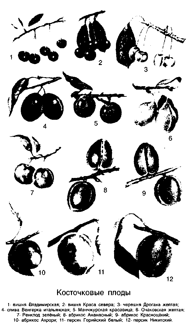 К косточковым плодам относят: сливы, вишни, черешни, абрикосы, персики, кизил. Эти плоды хранятся значительно хуже, чем семечковые, поэтому их после съема сразу же транспортируют в места потребления или используют на месте в свежем виде либо для переработки. Строение плода у всех косточковых почти одинаково. Он состоит из кожицы, мякоти и косточки, внутри которой находится ядро.