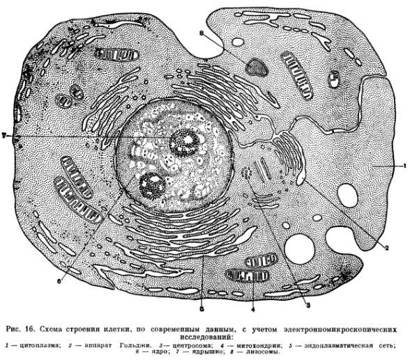 Рис. 16. Схема строения клетки, по современным данным, с учетом электронномикроскопических исследований: