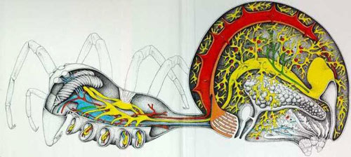 Внутри тела имеется обширная нервная система (на рис. синяя). Мозг расположен в головогруди, а сердце (на рис. красное) в передней верхней стороне живота. Сердце у паука бьется с частотой от 30 до 70 ударов в минуту. Когда паук - напряжен или истощен биение может учащаться до 200 ударов в минуту. С тыльной стороны живота расположены прядильные органы(spinners) (на рис. белые) производящие шелк. Они связаны с железами, которые производят различные белки. Когда эти белки смешиваются, они полимеризируются и образуется шелк. Жидкий шелк проходя через прядильные органы превращается в нить. Половой орган и яйце-производящий орган (на рис. белый) расположен между книжными легкими (на рис. оранжевый) и прядильными органами. Пищеварительный тракт (на рис.желтый) проходит через все тело. На конце его имеется экскреторная (выделительная) система (на рис. зеленая).