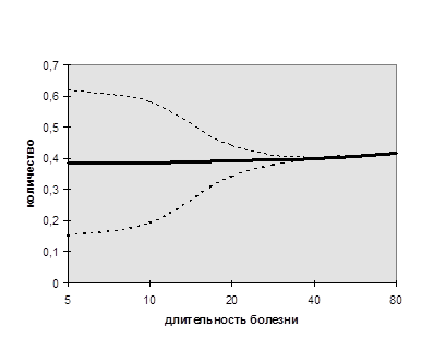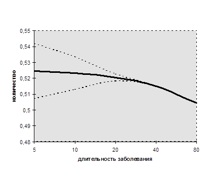 (при средней величине характеристики 0,5), после 10 месяцев она стремится к 0. Т.е. система имеет малые погрешности при условии большой длительности заболевания (слабой активности вируса), при уменьшении продолжительности система теряет свою устойчивость.