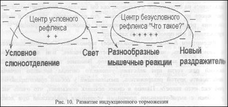 Взаимодействие систем может выражаться и в форме подавления реакций. Так, если выработан описанный выше условный рефлекс на гудок, то при одновременном звучании гудка и слов «гудок не гудит» условное движение тормозится. В этом случае вторая сигнальная система тормозит первую сигнальную систему.