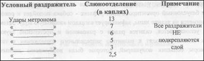 или иначе связанные с едой, например, вид посуды, из которой всегда кормят собаку, вид человека, который кормит собаку и др. Павлов пришел к выводу, что, в отличие от физиологического слюноотделительного безусловного рефлекса, «психическое» слюноотделение представляет собой особый рефлекс, названный им условным. Таким образом, первым шагом Павлова на пути исследования высшей нервной деятельности явилось разделение всех рефлексов на 2 большие группы: безусловные рефлексы, обеспечивающие реакцию на непосредственное раздражение рецепторов пищей и условные рефлексы, обеспечивающие слюноотделение на опосредованные внешние сигналы, так или иначе связанные с кормлением.
