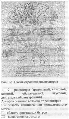 В реализации зрительной функции большую роль играет и кожный анализатор. Известно, что изображение предметов на сетчатке глаза перевернутое. Почему взрослый человек видит предметы правильно? В основе правильного восприятия предметов внешнего мира лежит индивидуальный опыт, предполагающий совместную работу затылочных, пре- и постцентральных областей. Новорожденный человек видит мир «вверх ногами». Однако, в ходе развития ребенка вырабатываются временные связи между зрительными полями, обеспечивающими предметное зрение, прецентральной зоной, обеспечивающей усилия соответствующих мышц, а также постцентральной юной, ответственной за кожную чувствительность. Таким образом, ребенок видит игрушку, прилагает мышечные усилия, чтобы взять ее, испытывает при этом целый комплекс кожно-тактильных ощущений. Кроме того, он слышит от взрослых название игрушки. Таким образом, в зрительных, двигательных, чувствительных и слуховых зонах коры больших полушарий одновременно образуются очаги возбуждения, иррадиирующего навстречу друг другу, что приводит к образованию сложной системы временных связей, составляющих основу «правильного» видения внешнего мира. Эти связи динамичны, что доказывается опытами, когда взрослому человеку надевают очки, которые делают изображение на сетчатке глаза не перевернутым, а правильным. Оказывается, первое время человек видит все предметы перевернутыми. Однако, очень скоро этот дефект компенсируется за счет образования новых временных связей между указанными выше зонами коры, и человек приобретает новый опыт «правильного» видения мира. Если человек снимает такие очки, то опять некоторое время он видит предметы перевернутыми. Однако, установление новых временных связей между зрительными, двигательными, чувствительными и слуховыми зонами восстанавливает нарушенную зрительную функцию.