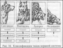 Павлов подвел естественнонаучную основу под предложенную Гиппократом классификацию. Наблюдая за поведением животных в течение 60 лет своей научной деятельности, Павлов был поражен разнообразием в поведении животных, в их способности образовывать многочисленные условные рефлексы, вырабатывать и изменять динамические стереотипы и пр. Павлов пришел к выводу, что основу этих различий составляют индивидуальные особенности двух основных нервных процессов в коре больших полушарий — возбуждения и торможения. В качестве основных свойств возбуждения и торможения он выделил: 1. силу нервных процессов; 2. уравновешенность нервных процессов; 3. подвижность нервных процессов. Различные комбинации этих свойств возбуждения и торможения позволили Павлову выделить 4 основных типа высшей нервной деятельности и соотнести их с типами темпераментов Гиппократа.Согласно схеме, всех животных можно разделить на 2 группы в зависимости от силы нервных процессов: слабый тип и сильные типы (рис. 16). Для представителей слабого типа характерна слабость, как процесса возбуждения, так и процесса торможения. Слабость процесса возбуждения проявляется в том, что животные не могут реагировать усилением условных реакций на усиление условных раздражителей. Это связано с низкой работоспособностью корковых клеток, в которых развивается запредельное торможение как мера биологической защиты клеток от переутомления. У представителей сильного типа увеличение или удлинение времени действия условного сигнала сопровождается усилением условнорефлекторного ответа. Представители сла бого типа соответствуют меланхолическому темпераменту по классификацииГиппократа.