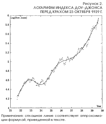 На рис. 2 показан логарифм индекса Доу-Джонса перед Великой депрессией. Для кризиса в Юго-Восточной Азии, многих финансовых пирамид характерна та же закономерность — быстрый рост с ускоряющимися колебаниями (которые могут служить предвестниками приближающейся катастрофы).