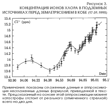 На рис. 3 показана концентрация ионов хлора в минеральных источниках перед гигантским землетрясением в Кобе. По сути, мы имеем одну и ту же зависимость с точностью до масштабов в системах совершенно разной природы! (Говоря математическим языком, хорошей асимптотикой для обеих зависимостей является закон