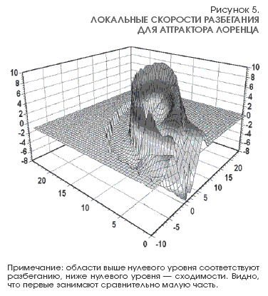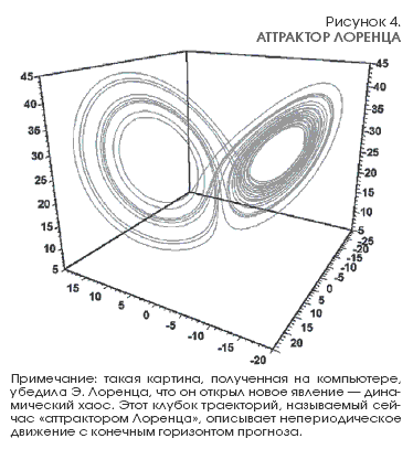 Эти исследования вывели на авансцену современного научного знания динамический хаос. Это хаотическое, непериодическое поведение в динамических системах, в которых будущее состояние однозначно определяется настоящим. Пример такого хаоса в простейшей системе, предложенной Лоренцем, дает странный аттрактор (см. рис. 4) в фазовом пространстве. Точки в этом пространстве характеризуют возможные состояния системы, траектории — ее динамику. Грубо говоря, точка крутится в этом случае некоторое время около одного «мотка траекторий», а потом перескакивает к другому, и время этого перескока в значительной мере случайно. Хаос в этом обличье представляется как сверхсложная организация.