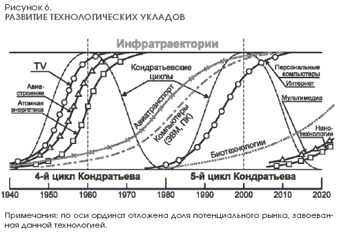 Новая Россия, погрузившись в пучину безуспешных реформ, пропустила почти все, что связано с V кондратьевским циклом. Сейчас мир начинает переход к VI технологическому укладу, фаворитами которого, судя по всему, станут биотехнологии, нанотехнологии, вложения в человека, новое природопользование, новая медицина.