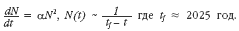 Исследования показали, что по этому закону численность человечества росла по крайней мере несколько сотен тысяч лет. Это режимы с обострением — численность человечества должна была бы стать бесконечной в 2025 г. Причина этой нелинейности в том, что человечество не только росло, но и постоянно расширяло ареал своего обитания, что, в отличие от всех других видов, оно создало технологии, позволяющие передавать информацию, важную для выживания, во времени (от поколения к поколению) и в пространстве (из одного региона в другой) [13].