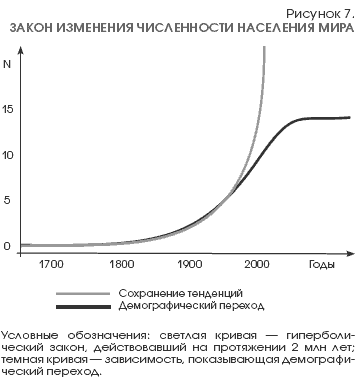 Главное содержание переживаемой человечеством эпохи — глобальный демографический переход. Это резкое (на памяти одного поколения) уменьшение скорости роста населения Земли. По сравнению с предыдущей траекторией, соответствующей гиперболическому закону, разница уже составила более 2 млрд человек. Это грандиозное изменение самих алгоритмов развития человечества, быть может, более важное и значимое, чем неолитическая революция. Именно это может определить масштаб и уникальность переживаемого кризиса. И изменения здесь тоже могут быть огромны. Весьма вероятен дефолт американской экономики. Известный математик академик В.П. Маслов и ряд других экспертов относят его на 2013–2014 гг.