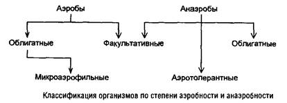 По отношению к молекулярному кислороду организмы подразделяются на аэробов и анаэробов. В свою очередь, аэробы и анаэробы подразделяются на облигатные и факультативные. Некоторые облигатные аэробы могут существовать при содержании кислорода, равном его содержанию в атмосфере или превышающем эту величину, но встречаются те, которые не переносят уровень кислорода, превышающий несколько процентов. В свою очередь, некоторые анаэробы, хотя и не используют кислород, но переносят его высокие концентрации в окружающей среде. Ряд микроорганизмов может резко менять чувствительность к кислороду в зависимости от типа питания, например водородные бактерии при выращивании в гетеротрофных условиях аэротолерангны, а в автотрофных – микроаэрофильны.
