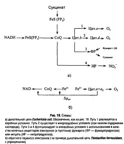 В отличие от митохондрий, состав дыхательной цепи у прокариот часто зависит не только от вида микроорганизма, но и от типа его питания, а также от содержания кислорода в газовой фазе. Примером может служить дыхательная цепь Escherichiacoli.