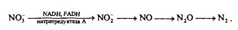Нитратным дыханием, или денитрификацией, называется дис-симиляционная нитратредукция, приводящая к образованию молекулярного азота с участием цепи переноса электронов и сопровождающаяся запасанием энергии. В этом случае ферменты локализованы в мембране: