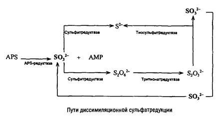 При диссимиляционной сулъфатредукции или сульфатном дыхании на первом этапе также образуется APS, который прямо восстанавливается до сульфита, а затем у разных организмов происходит либо одноступенчатое, либо трехступенчатое восстановление сульфита до сульфида.