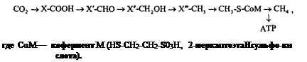 Как показано опытами с радиоизотопами, С02 акцептирует от водорода только электроны так как водород метана происходит из воды. Процесс восстановления протекает ступенчато с использованием цепи переноса электронов, включающей дегидрогеназы, редуктазы и переносчики электронов, содержащие цитохромы