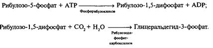 Включение С02 в конструктивный метаболизм у фототрофов осуществляется в последовательности реакций. Она называется циклом автотрофной фиксации углекислоты, или циклом Кальвина, который сходен с пентозофосфатным циклом катаболизма сахаров у хемоорганогетеротрофов. Приведем суммарное уравнение этих реакций: