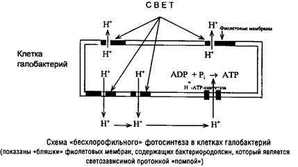 Особый тип фотосинтеза – без участия хлорофильных пигментов – обнаружен у экстремально галофильных архебактерий. Это единственный тип фотосинтеза, не включающий электрон-транспортную цепь. Клетки галобактерий содержат особый белок – бактериородопсин, включающий каротиноид – ретиналь. Совместно с фосфолипидами бактериородопсин формирует так называемые фиолетовые мембраны, которые в виде «бляшек» покрывают до 50% поверхности клеток. Под действием света бактериородопсин транслоцирует протоны из цитоплазмы в окружающую среду, создавая протонный ТЭП, который посредством Н+ -АТРсин-тетазы преобразуется в АТР.