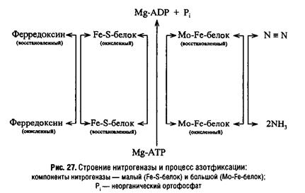 Пути синтеза этих и других компонентов клетки подробно изложены в фундаментальных курсах биохимии. На некоторых закономерностях синтеза биополимеров и механизмах регуляции этих процессов мы остановимся в последующих главах, а здесь рассмотрим имеющий чрезвычайно важное для конструктивного метаболизма значение процесс азотфиксации.