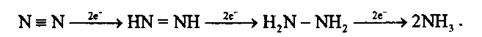 Для восстановления молекулы азота необходим перенос шести электронов, но за один цикл не может быть перенесено более двух электронов, поэтому процесс протекает не менее чем в трех последовательных стадиях: