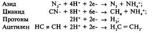 При быстрой остановке реакции из инкубационной смеси удалось выделить гидразин. По-видимому, промежуточные продукты остаются прочно связанными с нитрогеназой, которая способна восстанавливать и ряд других соединений: