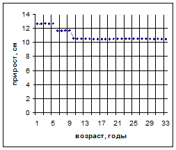 Выбрав несколько елей высотой 1-2 метра, нужно было определить их возраст по количеству мутовок ветвей (ель образует по 1 мутовке ветвей в год, кроме того, в течение первых 3-4 года жизни ель не образует мутовок, так что к полученному результату нужно было прибавить 3-4 года). Зная высоту и возраст, определить примерный прирост ели за год, рассчитать средний прирост для 10 елей. Также измерить диаметры стволов у растений разного возраста и, далее, рассчитать скорость утолщения стволов. По полученным данным мы заполнили таблицу 1 и построили график, где на оси X – годы, а на оси Y – средний прирост за этот год (см).