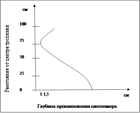 Ширина тропинки около 0,5 м. На графике видно, что при удалении от центра тропинки плотность почвы уменьшается, а в 0,5 м от тропинки незначительно увеличивается. Это связано с тем, что количество растений там увеличивается, и они корнями скрепляют почву.