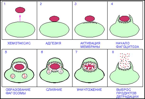 Фагоцитоз – явление поглощение и переваривание клеткой корпускулярного материала – бактерий, крупных вирусов, отмирающих собственных клеток организма и чужеродных клеток. Случайный контакт фагоцита с микробной клеткой приводит к тому, что фагоцит поглощает микробную клетку и за счет гидролитических ферментов происходит полное или частичное разрушение патогенна (см. приложение)