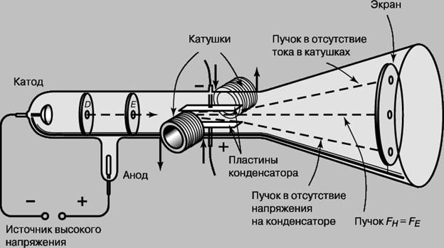 Кроме того, в той же области трубки с помощью пары катушек с током могло создаваться магнитное поле, способное отклонять электроны в противоположном направлении. Сила FH , действующая со стороны магнитного поля H , пропорциональна напряженности поля, скорости частицы v и ее заряду e :