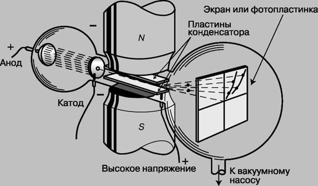 Рис. 2. МАСС-СПЕКТРОГРАФ, использовавшийся Томсоном для определения относительных значений массы различных атомов по отклонению положительных лучей в магнитном и электрическом полях.