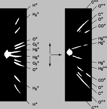 Рис. 3. МАСС-СПЕКТРЫ, фотоснимки с распределением ионизованных атомов пяти веществ, полученные в масс-спектрографе. Чем больше масса атомов, тем меньше отклонение.