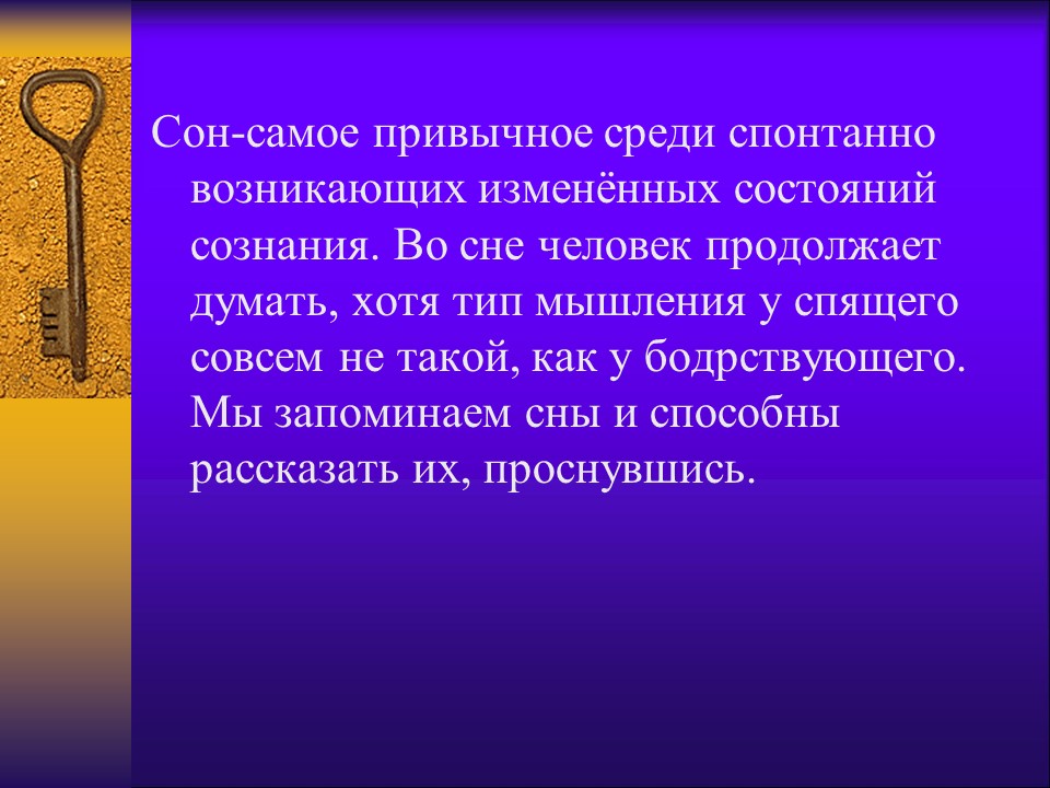 Сон-самое привычное среди спонтанно возникающих изменённых состояний сознания. Во сне человек продолжает думать, хотя тип мышления у спящего совсем не такой, как у бодрствующего. Мы запоминаем сны и способны рассказать их, проснувшись.