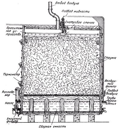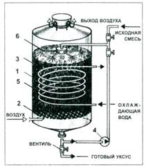 Основным аппаратом, в котором получают уксусную кислоту по методу Шуценбаха, является деревянный чан конической формы. На расстоянии 200 – 300 мм от основного днища в нем устанавливают горизонтальную перфорированную перегородку. Верхняя часть аппарата на 2/3 заполняется стружками, которые орошаются питательной для бактерий средой, содержащей некоторое количество уксусной кислоты (чаще всего это 6%-ный раствор), этиловый спирт (3 – 4%) и небольшое количество аммонийных и фосфатных солей. По мере протекания раствора бактерии, закрепившиеся, или иммобилизованные на стружках, окисляют спирт в уксусную кислоту. В нижней части аппарата скапливаются готовая продукция – 9%-ный уксус. В процессе окисления выделяется тепло, которое повышает температуру внутри аппарата до 30 – 35 ºС. В результате разницы температур создается естественная и довольно интенсивная конвекция. Воздух поступает в патрубки под ложным днищем, проходит через аппарат и выходит в верхней его части. Так сама собой осуществляется аэрация, необходимая для работающих бактерий.