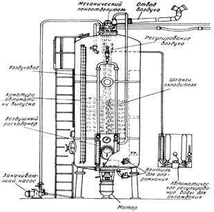 Способу Шуценбаха аналогичен циркуляционный способ Фрингса, в настоящее время на подавляющем большинстве предприятий производство уксуса ведется именно этим способом. Эта технология имеет немало общего с методом Шуценбаха. Здесь также используются аппараты, наполненные стружками, также на стружках иммобилизованы уксуснокислые бактерии, и также масса стружек орошается питательным раствором, содержащим спирт, уксусную кислоту и минеральные соли. Однако есть и существенные различия между этими методами. Прежде всего, это касается размера аппаратов. На некоторых предприятиях объем их заполнения стружками рабочей камеры достигает 60 м3. В такой аппарат (рис. 2.): через специальную распределительную систему подают 10%-ный раствор спирта со скоростью в несколько раз большей, чем по методу Шуценбаха. При помощи насоса раствор многократно циркулирует через аппарат до тех пор, пока весь спирт не окислиться и не образуется 9%-ный раствор кислоты. Около 10% исходного чистого спирта в этом процессе теряется. Цикл длится