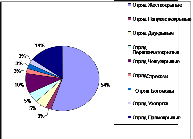 Анализ результатов исследования показал, что основу населения составляют представители отрядов жесткокрылые, полужесткокрылые и прямокрылые, составившие 37,3%, 16% и 10,7% соответственно к общему числу отмеченных видов.