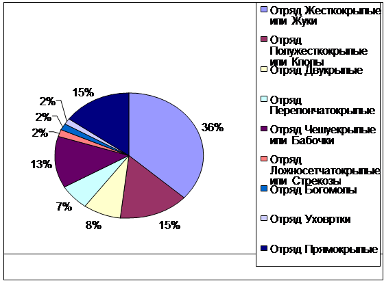 Отряд жесткокрылых доминировал как в количественном составе, так и по числу видов. Представители семейств мертвоеды, жужелицы, листоеды отмечены во всех исследуемых экотопах. (приложение 1). Вторым по видовой представленности и численности был отряд прямокрылых, представители которых неравномерно распределены в исследуемым экотопах. Наибольшее число видов отмечено на разнотравно-злаковых участках (15%). Среди полужесткокрылых доминирующими по численности были представители семейства вредные черепашки.
