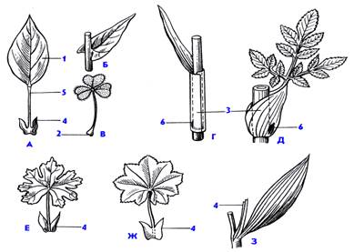 Рис.1. А - черешковый, Б - сидячий, В - с подушечкой в основании черешка, Г и Д - влагалищные, с прилистниками: свободными - Е, прирастающими к черешку - Ж, пазушными срастающимися - В. 1 - пластинка листа, 2 - основание черешка, 3 - влагалище, 4 - прилистники, 5 - черешок, 6 - пазушная почка