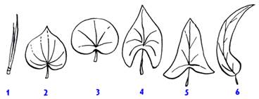 Рис.2. Особые формы листовых пластинок. 1 - игольчатая, 2 - серцевидная, 3 - почковидная, 4 - стреловидная, 5 - копьевидная, 6 - серповидная.