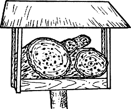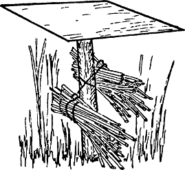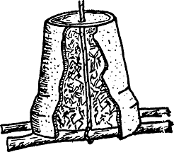 Для этого обыкновенный цветочный горшок заполняется сухой струйкой и в опрокинутом виде при помощи палочки закрепляется. Палочка должна несколько выступать за края горшка. Она привязывается веревкой, которая проходит через отверстие в дне горшка. Веревка крепится к ветке или стене таким образом, что палочка или край горшка соприкасается со стеной или с веткой.