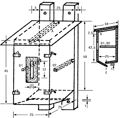 Домик-шмелевник обычно делается из досок в виде кубического ящика, грань которого равна 20 см. Крышка, как и у птичьих домиков, обязательно должна быть съемной. Шмелевники можно делать или двухэтажные, или улейки располагать горизонтально - на четыре-шесть семей. Внутренние стенки шмелиных улейков строгать не следует, иначе шмелям будет трудно по ним ползать. В одной из наружных стенок каждого улейка нужно просверлить круглое отверстие - леток диаметром 2 см, а под ним прибить небольшую прилетную дощечку.